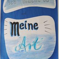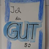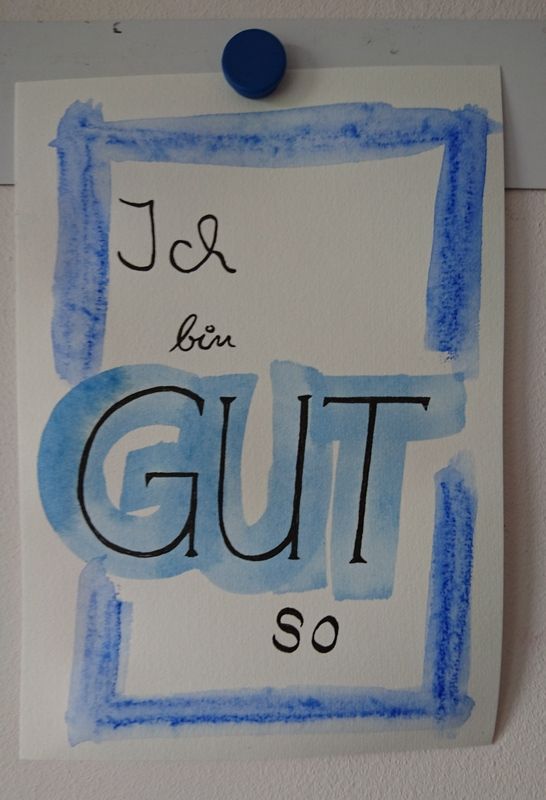 Wie klingt mein Satz, wenn ich ihn auf verschiedene Arten betone? "ICH bin stark" oder "Ich bin STARK"? Und wie finde ich die richtige Schrift um zart oder massiv, verspielt oder in Verbindung etwas aus zu drücken? Es wurden verschiedene Versuche gemacht und auch unterschiedliche Stifte und Materialein benutzt, um den stimmigen Ausdruck zu finden. so wurde Handlettering mit dem Filzschreiber geübt, mit der Feder geschrieben, oder großzügig gemalt.